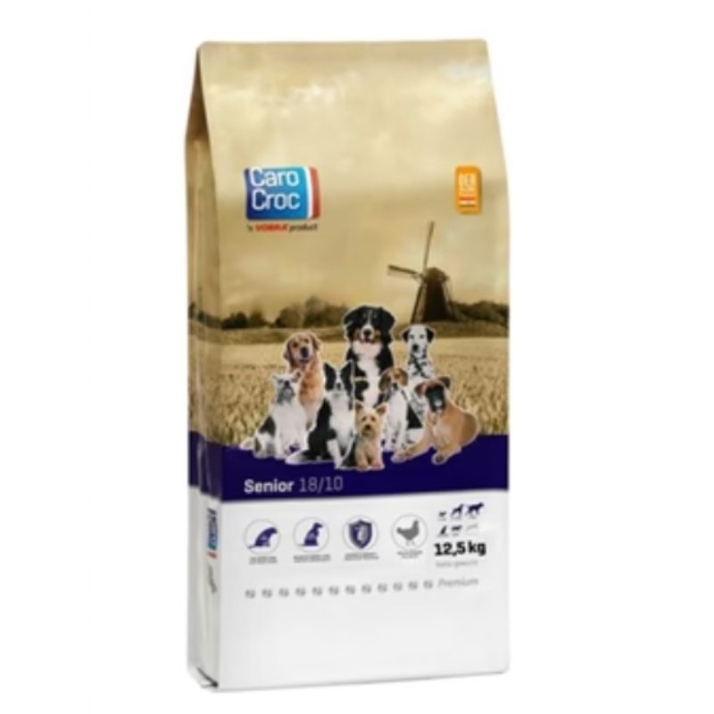 Carocroc Senior Silver 18/10 12.5 kg is a complete food for older dogs. Your dog's energy needs change as he ages. Older dogs have a lower need for proteins and minerals because their metabolism works more slowly and activity levels often decrease. Carocroc's Senior Silver has a low protein and fat content compared to average adult dog food.