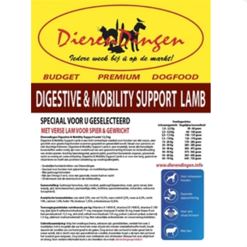 Budget Premium Digestive & Mobility Support Lamb is an easily digestible food for dogs of all breeds, particularly suitable for companion dogs that are played with and taken for walks. Ideal for boarding houses and non-pregnant breeding females. Digestive & Mobility Support Lamb is very tasty, contains all the necessary building blocks for a healthy and efficient body and maintains strong muscles, strong bones, healthy teeth, well-functioning organs, a shiny coat and few and solid stools. Digestive & Mobility Support Lamb is for a long, healthy and vital life and has a positive influence on food allergies.